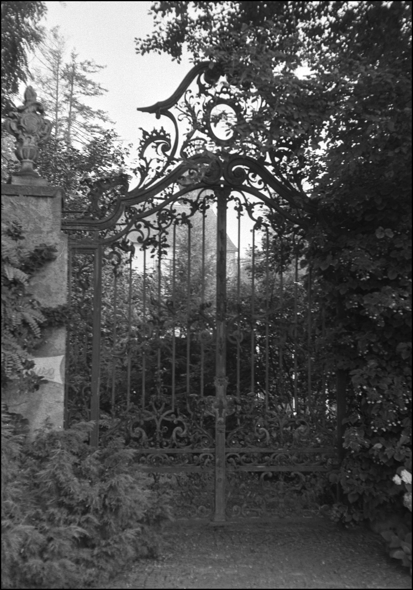 Vielleicht auf ältern Fundamenten errichtetes spätgotisches Giebelhaus mit spitzhelmigem, offenem Glockenträger und Türmchen, das sich zu achtseitigem zwiebelgekröntem Schaft verjüngt. Die Treppe schraubt sich um eine hölzerne Spindel hoch. Durch einen niedrigen Trakt verbunden ein in der zweiten Hälfte des 18. Jahrhunderts zugebautes, stark modernisiertes Mansardgebäude. Gitter des Parktores 1951 durch Barockkopie ersetzt.