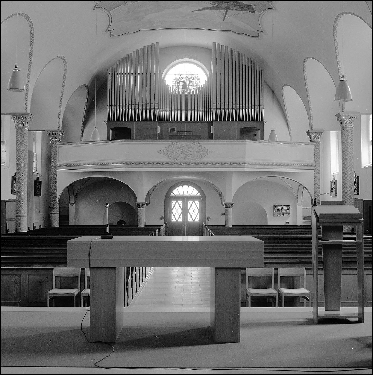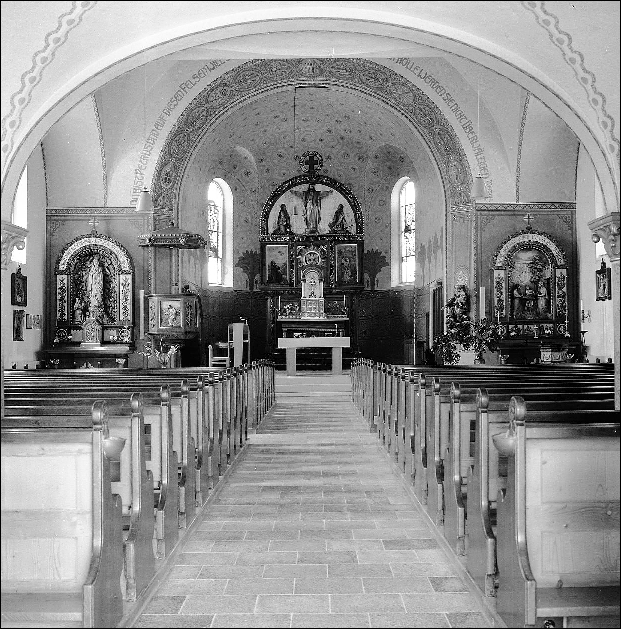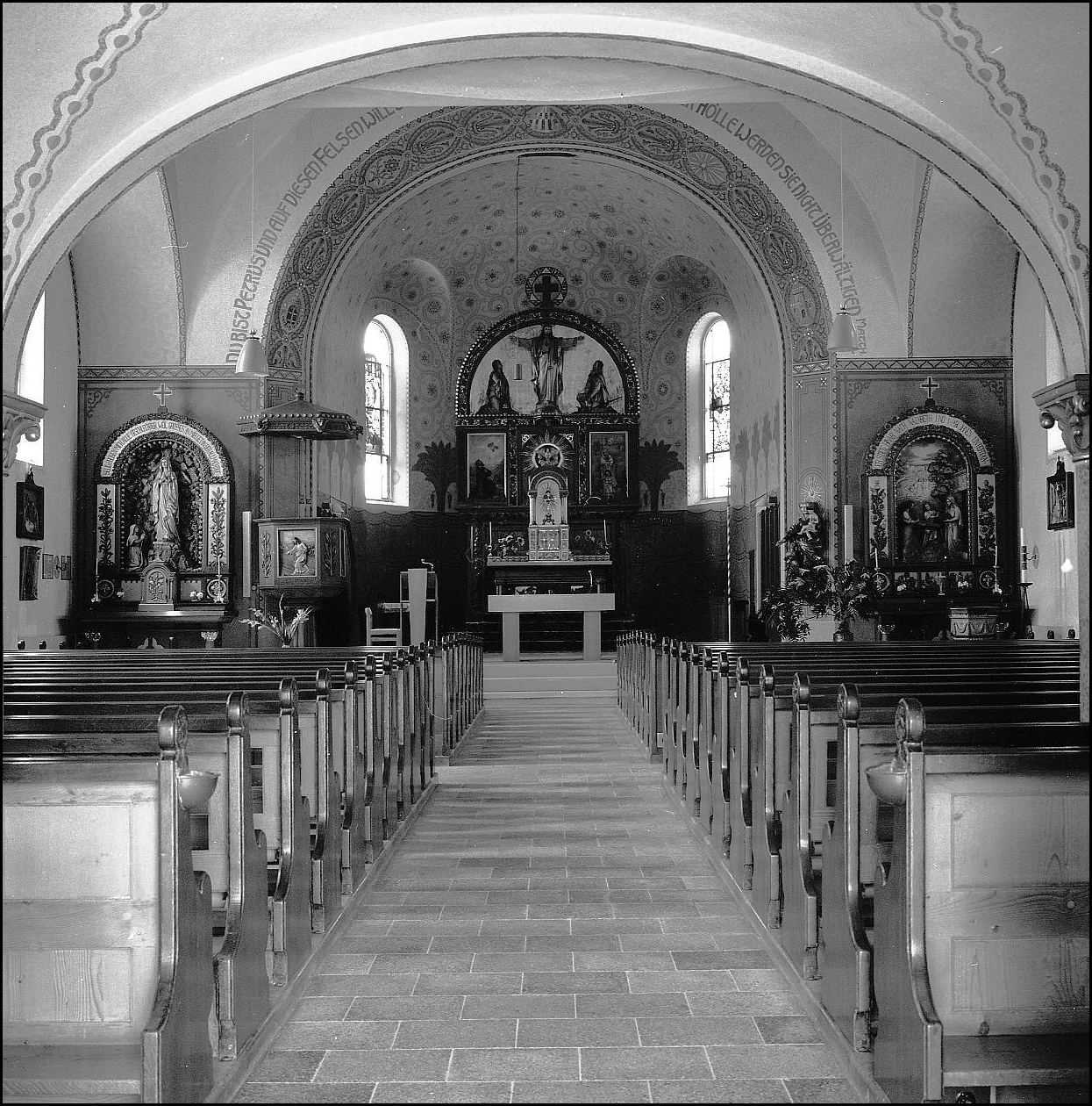 Im Jahre 1923 erhielt das Kircheninnere seinen künstlerischen Schmuck. Der Plattenbelag aus Kunststein wurde an Haug in Staad bei Rorschach vergeben. Die Gossauer Firma Bubenhofer und Eisele, spezialisiert auf Vergoldung, Kirchenmalerei und Stuckaturen, erhielt die Gipserarbeit und dekorierte die Oberflächen, während ihr Mitarbeiter I. Bezak die beiden Deckengemälde ausführte. Hochaltar und Seitenaltäre sowie Kanzel und Kreuzwegstationen schuf Christian Mahlknecht in St. Ulrich-Gröden (Tirol), die farbigen Fenster stammen von Lütz und Elmpt aus Emmishofen (Budget-Bericht 1994).