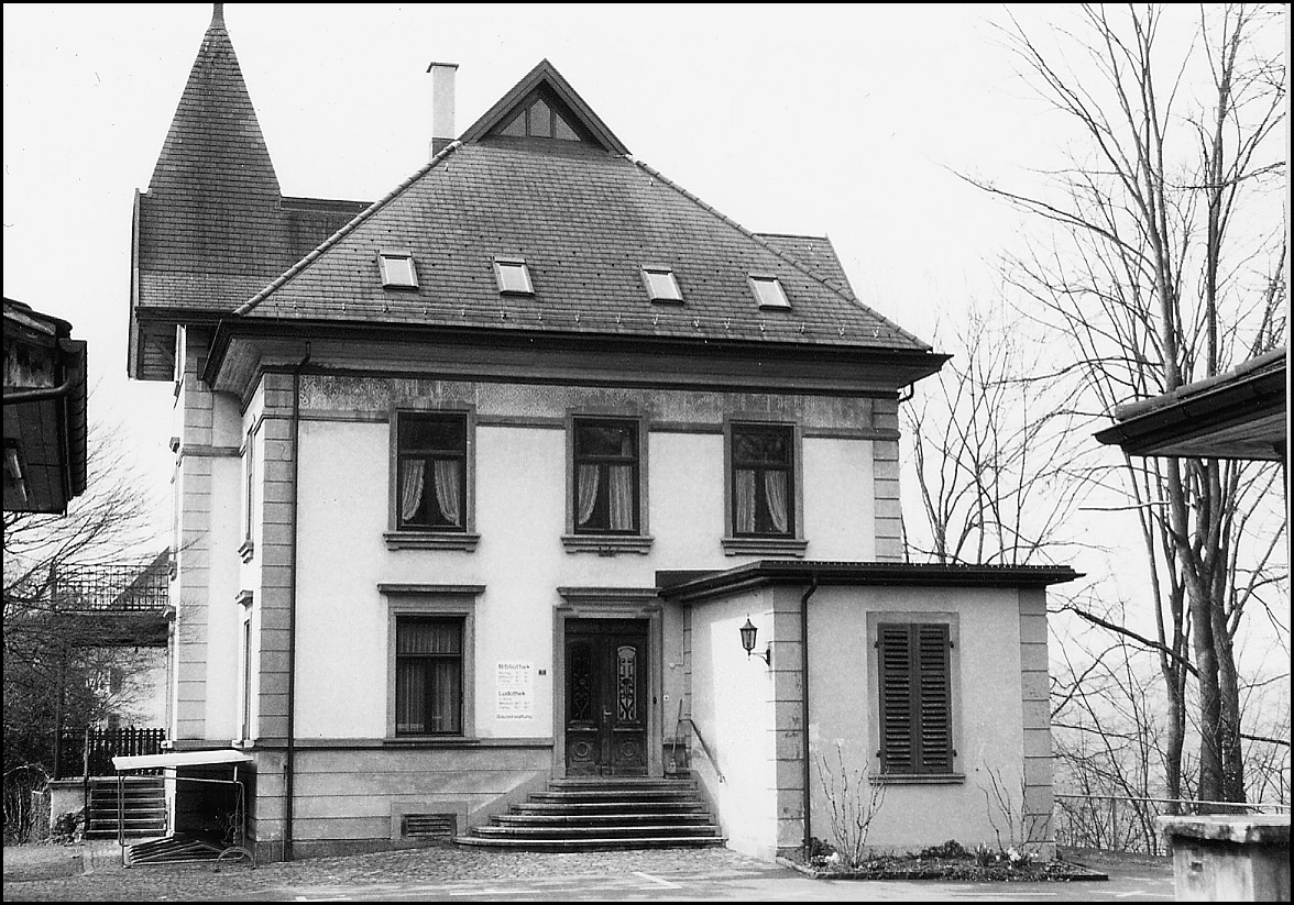 Würfelförmiger zweigeschossiger Verputzbau mit Eternitschieferdach und gequadertem Kellersockel; nordostseitiger Flachdachvorbau; von den beiden Risaliten ruht der stadtseitige unter einer Dachpyramide und hat eine Wetterfahne mit der Baujahrzahl 1901. Die dreiachsige Nordostfront wird von Quader imitierenden Putzlisenen eingebunden und ist durch Fuss- und Kranzgesims gegliedert. Die Sandsteinrahmung des zentralen und über einer Freitreppe angeordneten Einganges verläuft im Sturzbereich verkröpft; doppelflügelige, profilierte Holztüre mit scheibenbesetzten Quadraten und Lichtgitter. Vorspringende Fensterverdachungen; anspruchslose Fensterbärte. Den Dachvorsprung begleiten ein feiner Würfelfries und ein bemalter Fassadenstreifen; letzterer zeigt blaue und rote Rollornamentik auf weissem Grund. Die Südwestseite beherbergt doppelgeschossige Veranden mit gusseiserner Tragkonstruktion korinthischer Prägung. Gekehlte, verbretterte Dachuntersicht. Nebeneingang auf der Nordwestseite. Im Innern weitgehend originale, wenngleich etwas abgenutzte Ausstattung. Mit den Assekuranznummern 552 und 844 hofartig gruppiert; gepflästerter und asphaltierter Binnenraum. Auf einer Hangkante über dem einstigen Rebgelände gelegen. Dem 1901 neu errichteten Gebäude ging ein Vorgängerbau voraus; es handelte sich um ein bereits 1670 durch die Rietmanns errichtetes Farbhaus, das in den Brandversicherungsakten (BK) 1808 als 'Wohn- und Rebhaus' erscheint und wahrscheinlich in den 1820er Jahren um ein Farbgebäude erweitert wurde. Zur damaligen Farb auf dem Sandbänkli gehörten überdies ein weiteres, der nördlichen Hangkante bündig aufsitzendes Farbhäuschen sowie ein Stadel und ein Schopf; der Schopf wurde 1854/55 abgebrochen, Farbhaus und Stadel im Jahre 1900. Eine mit 'Sassnets-Fabrick in Bischofszell' bezeichnete Visitenkarte (anonyme Lithografie, abgebildet in: Müller 1992, Nr. 123) kann meines (CS) Erachtens dem Farb-Unternehmen auf dem Sandbänkli zugeordnet werden und dürfte um die Mitte des 19. Jahrhunderts entstanden sein. Dokumentation: Kartause Ittingen von einst zu jetzt. Denkmalpflege im Thurgau 3. Frauenfeld 2002. S. 196-197. - Brandkataster Staatsarchiv TG. |