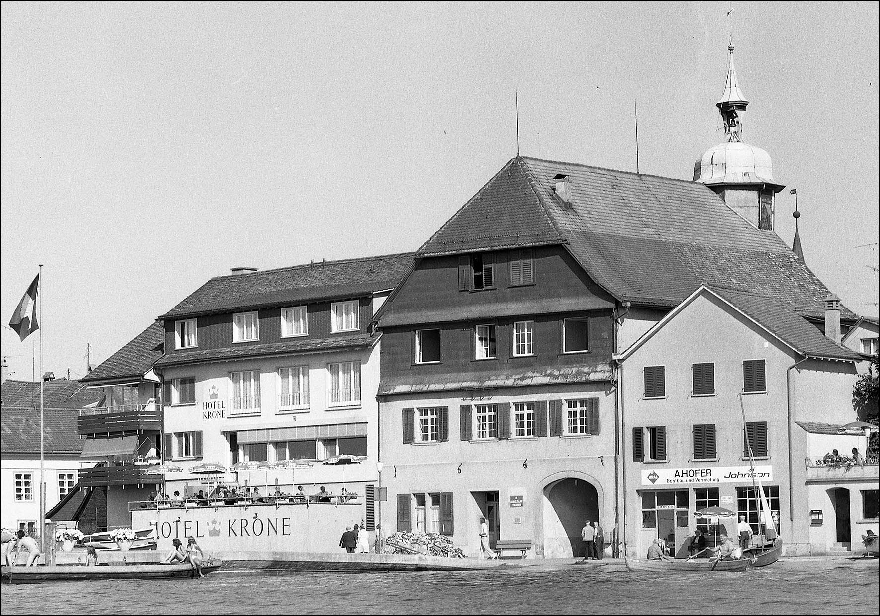 Hervorragender Fachwerkbau mit Vorplatz und Durchlass zwischen der Seestrasse und Schifflände. Bedeutende Innenausstattung. Die Vorderfront dominiert den Rathausplatz, die Rüäckfront mit dem behäbigen Dach und den geflammten Läden die Schifflände. '1667 wohl unter Benützung älterer Kerne errichtet von Werkmeister Samuel Schwederli. Freilegung des Riegelwerkes 1919, Gesamtrestaurierung in Etappen ab 1982. In der Mittelachse der platzseitigen Giebelfront ein achtseitiger Treppenturm mit Kuppeldach und Glockenträger. Wappentafel der Bürgermeister Daniel und Ulrich Hausmann 1667. Inneres: Keller und Gang mit noch spätgotisch profilierten Stützen. Ratstube mit Leistendecke. Im Nordost-Raum des 1. Obergeschosses Spätrenaissancetäfer und Felderdecke; Tresortüren von 1585 und 1667. Südost-Zimmer mit Turmofen von Heinrich Düringer 1784. Im Ratssaal des 2. Obergeschosses Kassettendecke mit Zapfenrosetten, 1667.' (Kulturschätze). Wahrzeichen Steckborns, an prominenter Stelle des Städtchens gelegen, zwischen Schifflände und Seestrasse. Die Position an der Seestrasse ist nicht beliebig, sondern genau bei der Einmündung der Kirchgasse in die Seestrasse. Das Rathaus erscheint also als zurückversetzter Fluchtpunkt der Kirchgasse. Es bildet das weltliche Pendant zur erhöht gelegenen Stadtkirche. Die zentrale Achse des alten Städtchens verläuft vom Kirchplatz und dem dortigen Kirchgass-Brunnen zum Rathaus mit dem Rathaus-Brunnen auf dem Rathausplatz. Dokumentation: Raimann, Alfons / Erni, Peter. Die Kunstdenkmäler des Kantons Thurgau. Band 6: Der Bezirk Steckborn. Bern 2001 (mit ausführlicher Baugeschichte und Beschreibung). - Kulturschätze im Thurgau entdecken und erleben. Bearbeitet von Cornelia Stäheli. Fotos von Rolf A. Stähli. Frauenfeld 2003. - Das Bürgerhaus in der Schweiz. XIX. Band, Zürich 1928. XLVIII, Tafel 73-75. - Früh, Margrit. Steckborner Kachelöfen des 18. Jahrhunderts. Frauenfeld 2005. Nrn. 122, 123, 155, 193, 221. - Amt für Denkmalpflege, Budget-Berichte 1988, S. 12ff. - Müller, Ernst (Hg.). Der Thurgau in alten Ansichten. Druckgraphiken von 1500 bis um 1880. Frauenfeld 1992. Nr. 740. - Bärtschi, Hans-Peter. Industriekultur in der Ostschweiz und im Fürstentum Lichtenstein. Unterwegs zu 333 Schauplätzen des produktiven Schaffens in den Kantonen Schaffhausen [, Thurgau], St. Gallen, Appenzell Inner und Ausserrhoden und im Fürstentum Lichtenstein. Informationsplattform für schützenswerte Industriekulturgüter der Schweiz (ISIS), ein Projekt der Schweizerischen Gesellschaft für Technikgeschichte und Industriekultur (SGTI) und der Firma Arias-Industriekultur. Zürich 2012, S. 67. - Gutscher Daniel. Steckborn. Schweizerische Kunstführer. Hg. Gesellschaft für Schweizerische Kunstgeschichte. Basel 1977, S. 11-13. - Oase im Alltag. Gärten und Freiräume im Thurgau. Denkmalpflege im Thurgau 22. Basel 2020, S. 161-162. - Keller, Sarah u. Kaufmann, Katrin. Die Glasmalereien vom Mittelalter bis 1930 im Kanton Thurgau. Corpus vitrearum, Schweiz Reihe Neuzeit, Bd. 8. Berlin 2022, S. 36. - Brandkataster Staatsarchiv TG. |
