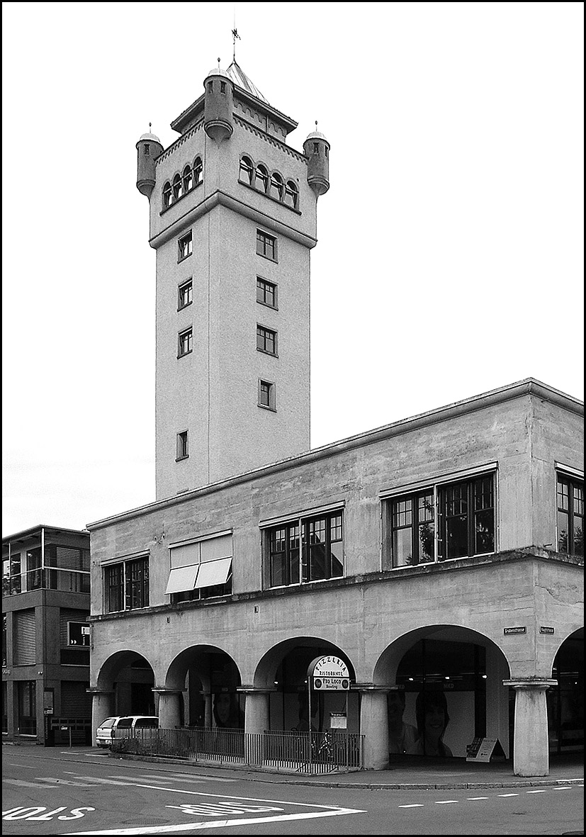 Der südliche, durch Korbbogenarkaden ausgezeichnete Eckbau B wurde vom Unternehmer in Anlehnung an das Haus "Zur Straussfeder" (Walhallastrasse 4) als markanter Giebelbau geplant, 1922 jedoch in Sichtbeton, nur zweigeschossig und flach gedeckt ausgeführt. Ebenfalls nach Schädlers Plänen entstand der 30 Meter hohe, mit Eckerkern ausgezeichnete Turm, der in erster Linie als Hochkamin diente (enthielt zwei Glühöfen, Wassertank für die hydraulischen Pressenen, Zentralheizung, Liftschacht und Treppenhaus). Er wurde schon kurz nach seiner Errichtung (1927) zu einem der Wahrzeichen Arbons.