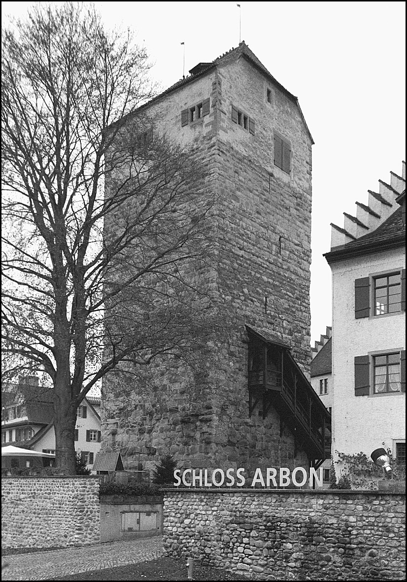 Mächtiger, ursprünglich freistehender Wohn- und Befestigungsturm, um 1220 auf einem älteren, ev. römischen Sockel erbaut, möglicherweise im Zuge der Stadtbefestigung durch einen Mauerring. Oberstes Geschoss mit Krüppelwalmdach von 1515-20, als die Schlossanlage neu errichtet wurde. Standort auf einem natürlichen Hügel, im spätrömischen Kastellareal von Arbor Felix, welches auch die St. Martins-Kirche und die Galluskapelle umfasst. Erste urkundliche Erwähnung einer Schlossanlage bereits 720 (St. Galler Klosterchronik). Im Besitz des Bistums Konstanz, Lehen an die Herren von Arbon. 1826-1907 Sitz der Seidenband-Weberei Stoffel, die 1856 einen Fabrikanbau an den Turm erstellte (1908 abgebrochen). Renoviert 1971 und 1991-93 mit Beiträgen der Denkmalpflege.