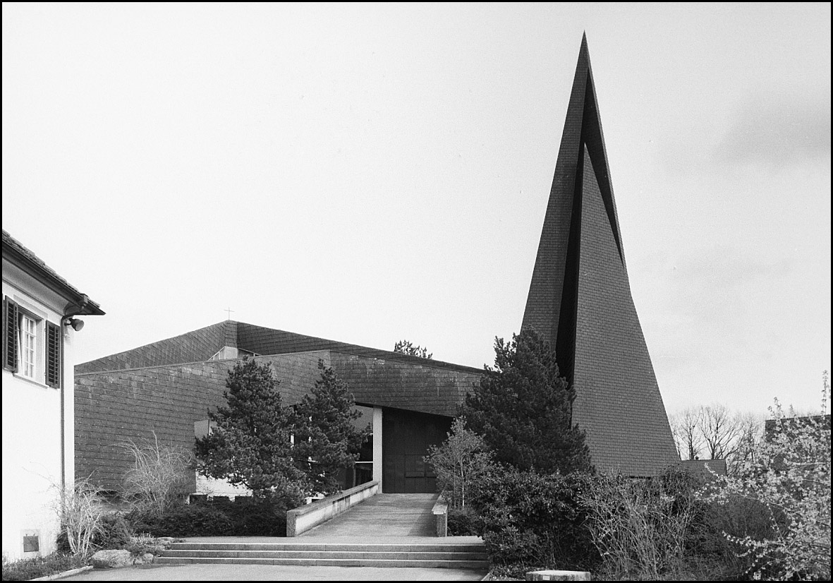 Kath. Kirche, Neubau 1964/65 über älterem Vorgängerbau, von Justus Dahinden. Einzigartige, verwinkelte Zeltdachkirche in expressiven, modernen Formen mit weit heruntergezogenem, eternitverschaltem Kirchensaal über Sichtbeton-Socke mit trapezförmigem Grundrissl und schafkantigem Kirchturm, dessen Pyramidendach zur Belichtung der Höhe nach aufgeschlitzt ist. Der erhöhte Zugang erfolgt über drei breiten Stufen und eine ansteigende Rampe. Im sockelartigen, geländeausgleichendem Untergeschoss finden sich die Gemeinderäume. Inneres mit bauzeitlicher Ausstattung und Ausstattungsteilen der Vorgängerkirche. Der eindrückliche Kirchenbau findet sich in ecklagiger Position und fügt sich mit seiner gestaffelten, winkligen Form aussergewöhnlich gut in das Ortsbild ein. Einweihung am 23. Januar 1966 nach Plänen des Zürcher Architekten Justus Dahinden anstelle der 1964 abgebrochenen Kirche von 1451. Moderne Ausstattung von Albert Wider, Widnau zusammen mit übertragene Wandmalerei-Fragmente. Der aussergewöhnliche Kirchenbau der Moderne zählt aufgrund seiner historischen und ortsbaulichen Eigenschaften sowie seiner herausragenden architektonischen Gestaltung und Konstruktion zu den bedeutenden Bauten am Ort. Dokumentation: Wolgensinger, Michael. St.-Franziskus-Kirche Hüttwilen [Hrsg.: Römisch-katholische Kirchgemeinde Hüttwilen]; Frauenfeld 1965. - Raimann, Alfons / Erni, Peter. Die Kunstdenkmäler des Kantons Thurgau. Band 6: Der Bezirk Steckborn. Bern 2001, S. 138-141. - Raimann, Alfons / Erni, Peter. Die Kunstdenkmäler des Kantons Thurgau. Band 6: Der Bezirk Steckborn. Bern 2001 (erweitertes Manuskript im Amt für Denkmalpflege), S. 16-18. - Bauen im Thurgau. Architekturlandschaft des 20. Jahrhunderts. Hg. Hochbauamt des Kantons Thurgau. Sulgen / Zürich 2003, S. 197. - Kulturschätze im Thurgau entdecken und erleben. Bearbeitet von Cornelia Stäheli. Fotos von Rolf A. Stähli. Frauenfeld 2003, S. 149. - ICOMOS Liste historischer Gärten und Anlagen der Schweiz / Kanton Thurgau. 1997. Exemplar im Amt für Denkmalpflege, Frauenfeld. - Hux, Angelus/Troehler, Alexander. KlangRäume. Kirchen und Orgeln im Thurgau. Frauenfeld 2007, S. 252-253. - Amt für Denkmalpflege, Budget-Berichte 1967. - Güntert, Gabriela. Sie bauten den Thurgau: Die Architekten Brenner. Denkmalpflege im Thurgau 6. Frauenfeld 2004. Nr. 15. - Girsberger, Hans / Adler, Florian. Architekturführer Schweiz. Zürich 1969, S. 159. - modern bauen. Thurgauer Nachkriegsmoderne 1940-1980. Denkmalpflege im Thurgau 17. Basel 2015, S. 34-35, 38-39. - Ducret, Madeleine et al. (Hg.). Schätze des Glaubens. Kostbarkeiten aus dem Besitz der thurgauischen Kirchgemeinden. Frauenfeld 1999, S. 569, 599. - Kirchenbau 1869-2019. 150 Jahre Landeskirchen im Kanton Thurgau. Denkmalpflege im Thurgau 21. Basel 2019, S. 40+58+59. |
