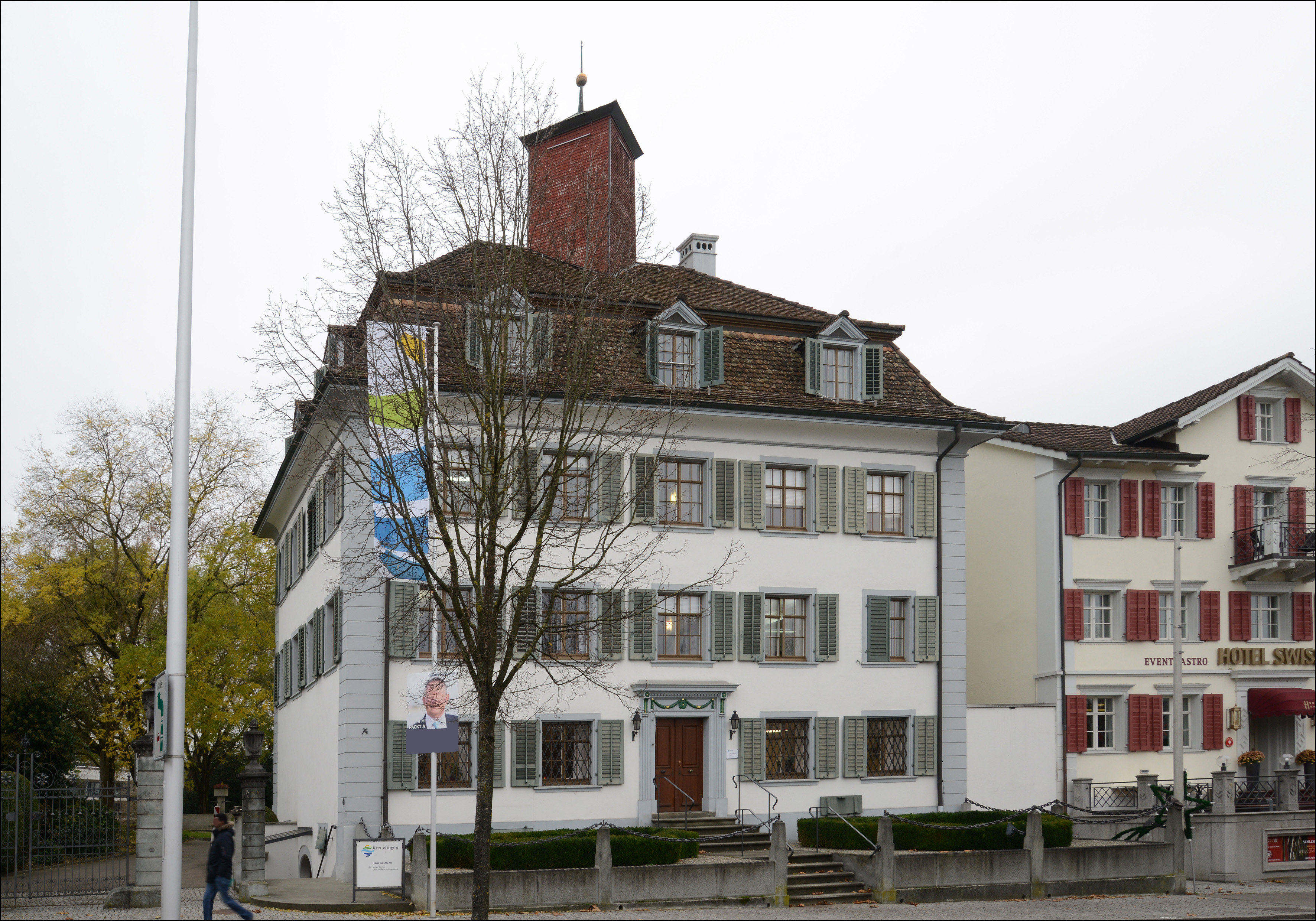 Verwaltungsgebäude/Sallmann’sches Haus, zwischen 1688 und 1733 erbaut, klassizistische Gestaltung von 1815 unter Gemeindeammann Johann Ulrich Bächler. Dreigeschossiger Gebäudekomplex in Mischbauweise, bestehend aus dem strassenseitigen Kopfbau mit Mansardwalmdach und über Eck gestelltem Dachreiter, dem westlichen Hinterhaus mit Giebeldach und einem zweigeschossigen flachgedeckten Verbindungsbau mit Dachterrasse zur Scheune. Fassadengliederung durch regelmässige Befensterung, am Kopfbau zusätzlich rustizierte Eckpilaster. Kopfbau glatt verputzt, Dachreiter mit Schindelschirm. Hinterhaus und Verbindungsbau mit modernem Strukturputz, bei Hinterhaus südliche Fassade in Obergeschossen mit Holzschindelschirm und Giebelfeld mit Blechschindelschirm. Haupteingang strassenseitig mit zweiflügliger Rahmenfüllungstür, mehrstufiger Steintreppe und klassizistisch verziertem Türgewände aus Sandstein mit Gebälk und farbig abgesetzter Festonverzierung. Südliches Kellertor mit Rundbogen und modernem Vordach aus Glas. Moderne mit Glas geschlossene Eingangssituation in Nische am Hinterhaus. An Verbindungsbau moderner Eingang und Garagentor. Einfache Fenstergewände aus Sandstein bei Kopfbau, im EG mit Fenstergitter. Übrige Gewände aus Holz oder Stein. Jalousieklappläden aus Holz. Auf Mansarddach strassenseitig drei, gegen Norden und Süden jeweils zwei Dachhäuschen. Auf Hinterhaus gegen Süden drei Schleppgauben. Im Innern Teile der historischen Ausstattung mit klassizistischer Supraporte-Malerei (Darstellung mit Weinverlad im Konstanzer Hafen mit Blick auf Kreuzlingen) und barocker Ofenkomposition erhalten. Das Gebäude ist Teil des barocken, ortsbaulich relevanten Prospekts entlang der Hauptstrasse zwischen Löwen- und Bärenstrasse. Zusammen mit der Hauptstrasse 74.1 bildet es einen Hinterhof, der sich zum Sallmann’schen Park öffnet. Strassenseitig vor dem Gebäude ein erhöhter, ummauerter Ziergarten. Zwischen 1688 und 1733 Neubau des fünfachsigen Kopfbaus mit Quergiebel zur Strasse durch Hans Ulrich Somontay-Meyer. 1748 Bau des Hinterhauses durch Amadeus Somontay-Morell. 1784 Neubau eines freistehenden Weinkellers mit Küferwerkstatt und Säulenhalle auf gegenüberliegenden Strassenseite und Aufbau eines florierenden Weinbetriebs. 1805 Erwerb des benachbarten Stephaner-Torkels und der dazugehörigen Rebgüter. 1813 Kauf und Abbruch des Verbindungsbaus zum Olbrecht’schen Haus und Umgestaltung der Anlage zum klassizistischen Palais mit Park, Orangerie und Glashaus durch Johann Ulrich Bächler. 1835 Verbindung des Kopfbaus mit Hinterhaus. 1860 Aufgabe des Weinhandels. 1868 Abbruch des Stephaner-Torkels und des Weinkellers im Zuge des Strassenausbaus. 1871 Verkauf des nördlichen Durchgangs mit Keller des ehemaligen Olbrecht’schen Guts an den Besitzer des Schweizerhofs. 1879 Brand und anschliessender Wiederaufbau der rückseitigen Scheune (Assek.-Nr. 39/4-0043). 1924 erbte Familie Sallmann das Gut. 1929 Verkauf des Dreispitz- und der Festwiese (ehem. Rebberg) an Gemeinde durch Albertine Vogler-Sallmann. Seit 1968 Villa und Park im Besitz der Stadt. 1975 Innenrenovation, 1979 Aussenrenovation mit Freilegung des Fachwerks beim Hinterhaus, 2000 Renovation Hinterhaus (verglaste Eingangssituation), 2002 Aussenrenovation Kopfbau, Zwischen 2017 und 2022 Fassadenrenovation mit Anbringung des Holzschindelschirms am Hinterhaus. Das Gebäude zählt als barockes Weingut aufgrund seiner architektur- und ortsgeschichtlichen Eigenschaften zu den bedeutenden Bauten am Ort. Dokumentation: Brandkataster Staatsarchiv TG. - Erni, Peter/Raimann, Alfons. Die Kunstdenkmäler des Kantons Thurgau. Band 7: Der Bezirk Kreuzlingen I. Die Stadt Kreuzlingen. Bern 2009. S. 296-299. - Bildarchiv Weltin. Stadt Kreuzlingen. – Baukultur Entdecken: Ein Spaziergang mit dem Thurgauer Heimatschutz. Kreuzlingen/Weinfelden 2006. – Luftbilder map.geo.admin.ch. |
