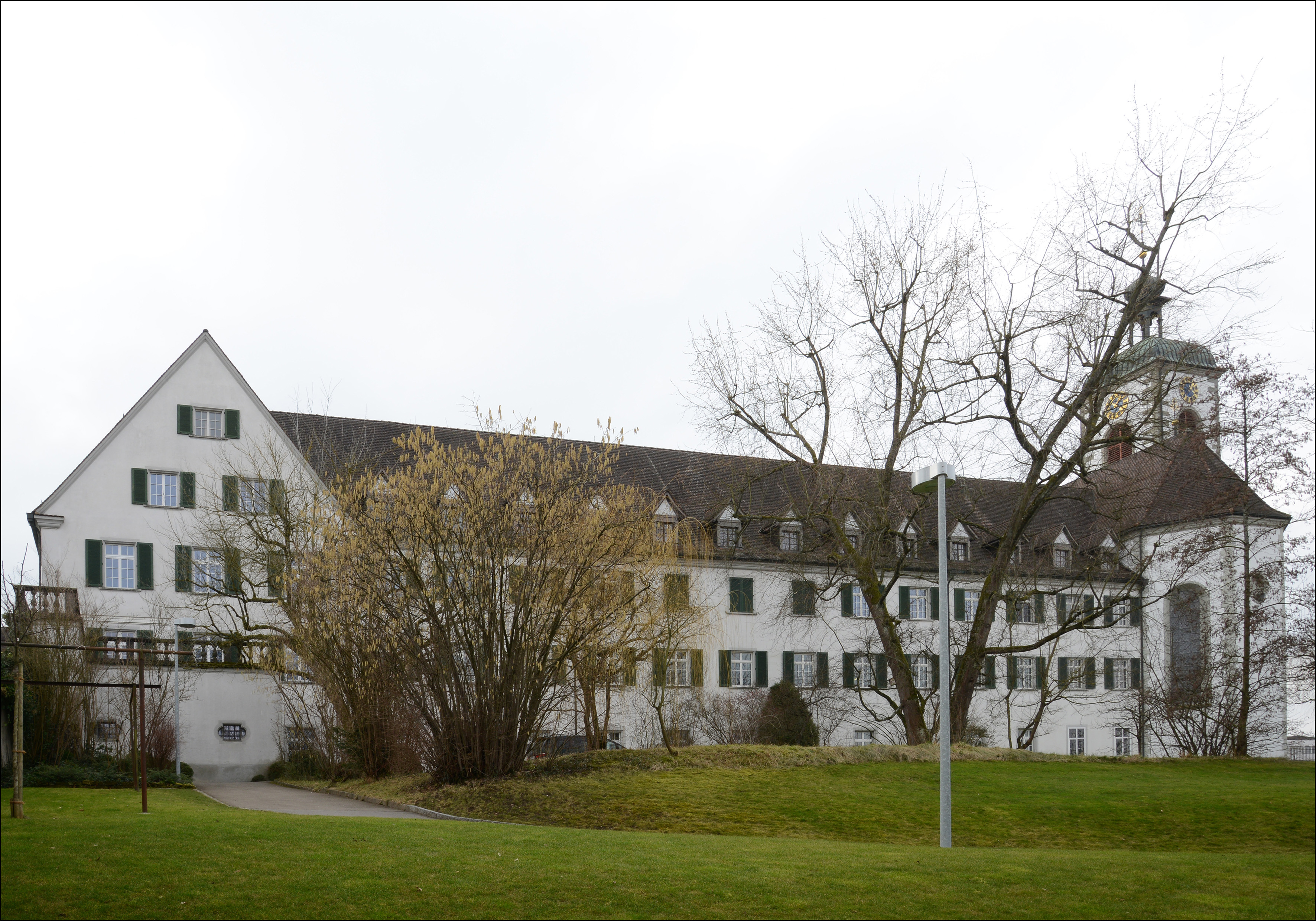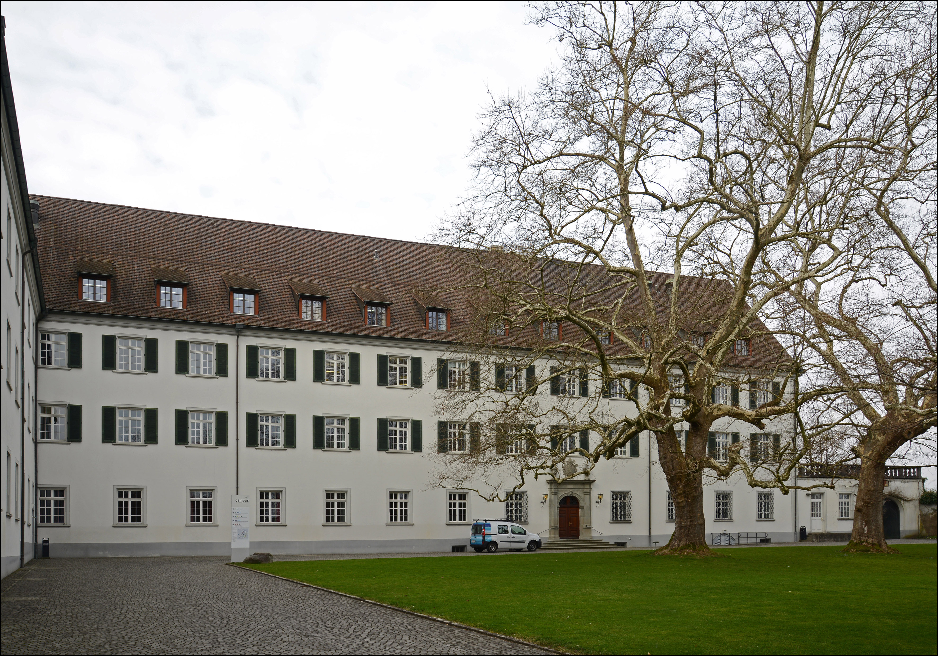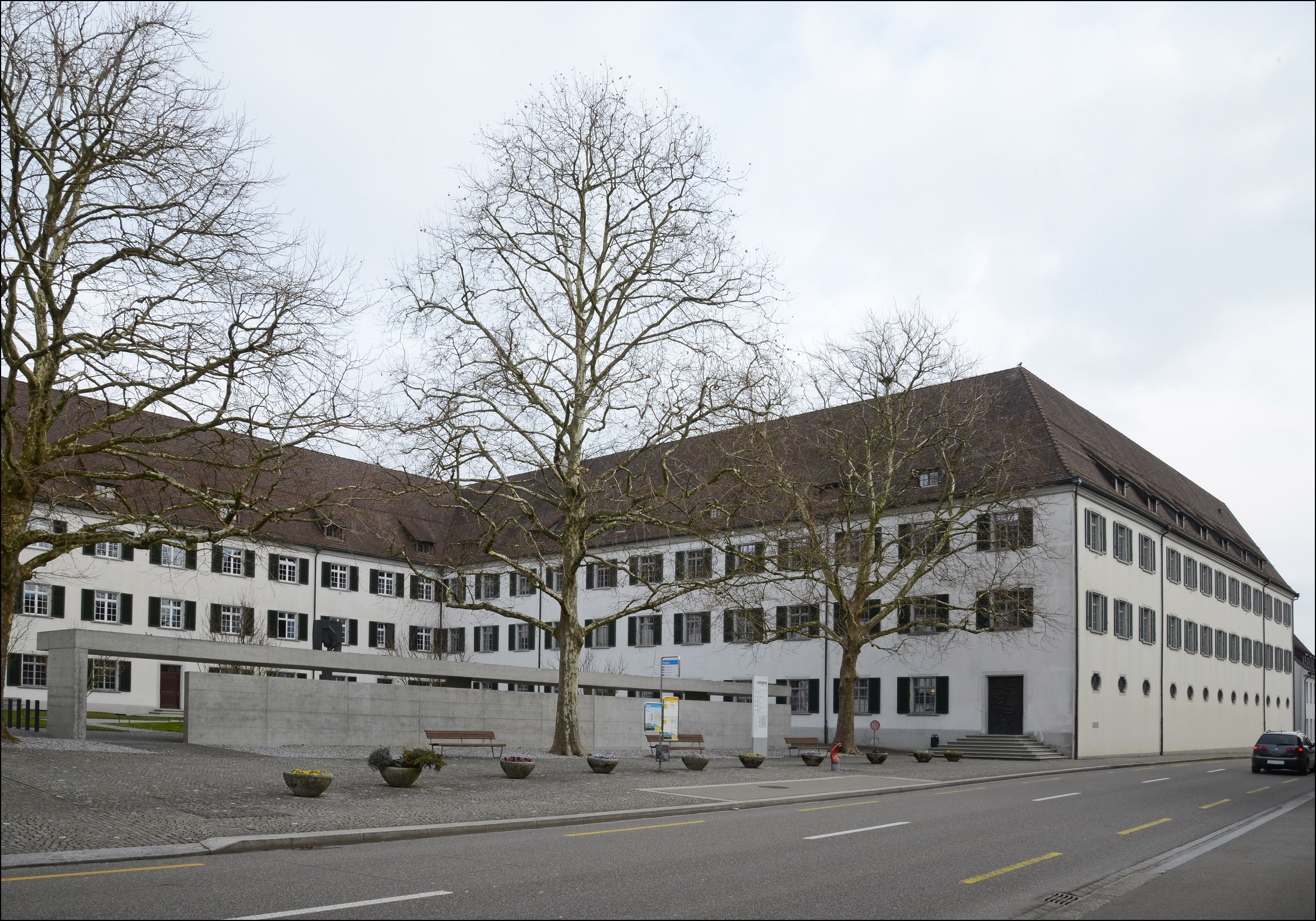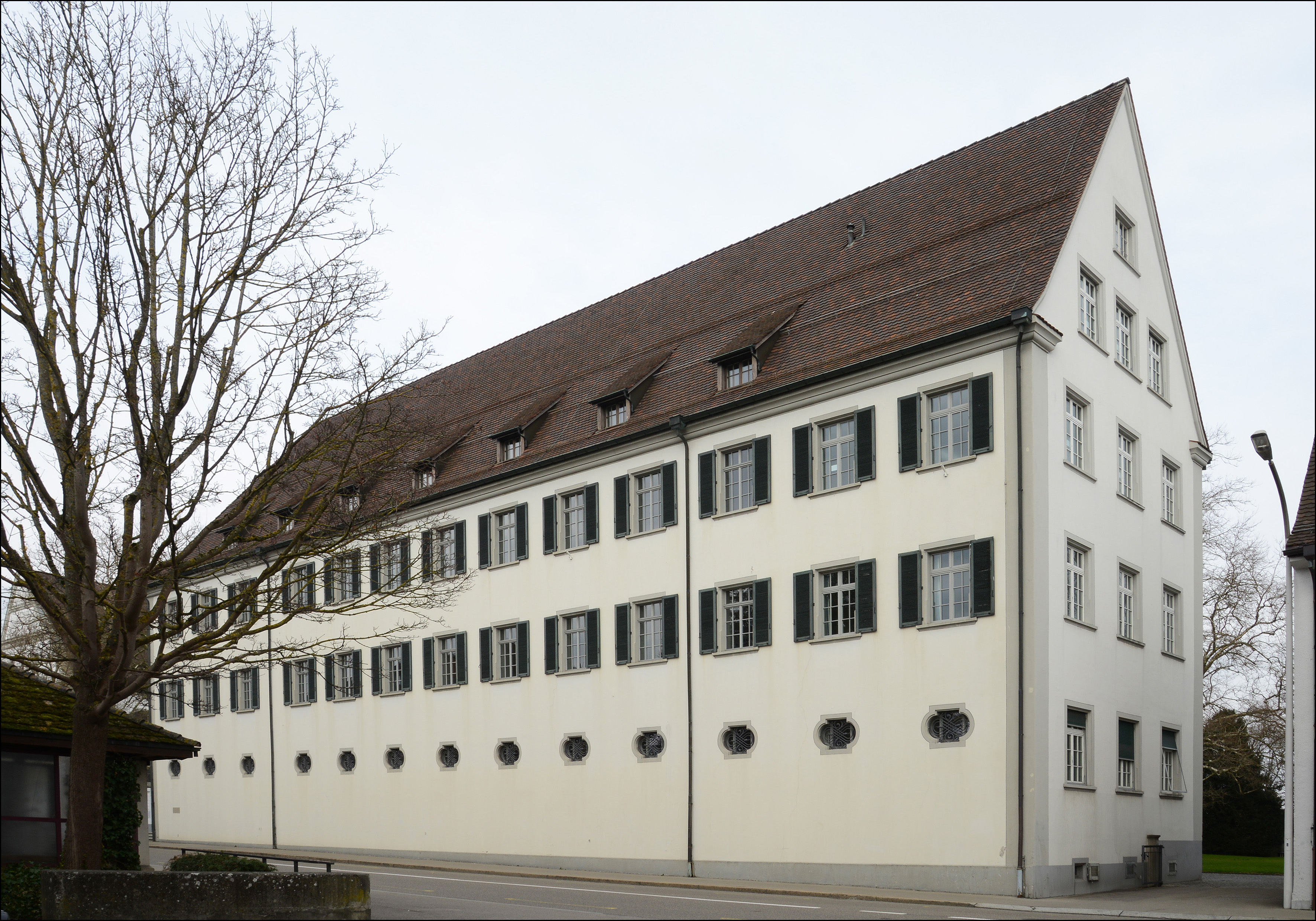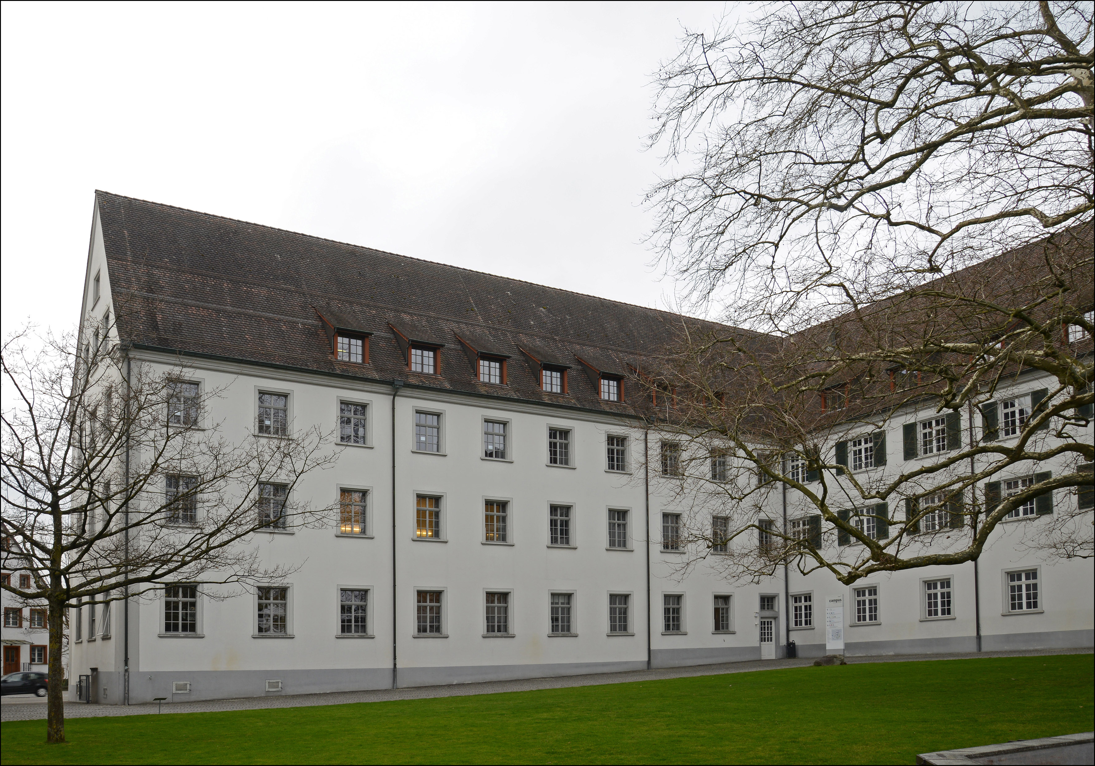 Ehem. Augustiner-Chorherrenstift, heute Pädagogische Maturitätsschule, ab 1665 erstellt, in Teilen 1963-67 nach Brand wieder aufgebaut. Z-Förmige Gebäudeanlage südöstlich der Kirche. Alle Fassaden durch eine regelmässige Befensterung gegliedert, z.T. mit Ziergittern oder Jalousieklappläden versehen. Im EG der SW-Fassade des südlichen Traktes eine Reihe von Ochsenaugen mit Sandsteingewänden und reich verzierten Ziergittern. Fassaden mit Abrieb verputzt, Sockel grau abgesetzt. Im Mitteltrack (SO) zum Klosterhof das segmentbogige Hauptportal mit reich verziertem Sandsteingewände mit floralem Schlussstein, profilierten Gewänden, mit Pilastern, Architrav und verkröpfter profilierter Verdachung. Darauf verzierte Sandsteinvasen. In der Mitte über dem Portal eine Wappenkartusche aus Sandstein. In der Nordwestfassade modernes zweiflügliges Bronceportal. Dachdeckung mit Biberschwanzziegeln, auf den Dachflächen gleichmässige angeordnete Schlepp- oder Giebelgauben. Am Mitteltrakt gegen NO eine Altane mit Terrasse, Brüstung mit Vasenbalustern. Inneres mit dichtem Bestand an zeittypischer, qualitätvoller Ausstattung. Klosteranlage steht auf flachem Hügelzug und breitet sich entlang der Hauptstrasse aus. Zwischen Kirche und Verwaltungsflügel zur Hauptstrasse hin offener Kreuzganghof. Gegen Osten weiterer Innenhof, der zur modernen Schulanlage im Norden überleitet. 1665-1668 Neubau des Konvent- und Prälaturflügel, 1671 Neubau des Gästeflügels, 1684-1686 Neubau des Bibliothekflügels. Um 1750 und 1761/62 eingreifende Umbauten unter Abt Prosper Donderer. 1848 Aufhebung des Klosters und Umnutzung zum Lehrerseminar. 1855 Abbruch des Bibliothekflügels. 19./20. Juli 1963 Brand der Kirche und der angrenzenden Konventsbauten, 1963-1967 Wiederaufbau unter Ausklammerung völlig zerstörter Räume. Das Gebäude zählt aufgrund seiner geschichtlichen, gestalterischen und ortsbaulichen Eigenschaften zu den bedeutenden Bauten am Ort. Dokumentation: Güntert, Gabriela. Sie bauten den Thurgau: Die Architekten Brenner. Denkmalpflege im Thurgau 6. Frauenfeld 2004. Nr. 12. - Müller, Ernst (Hg.). Der Thurgau in alten Ansichten. Druckgraphiken von 1500 bis um 1880. Frauenfeld 1992. Nr. 495ff. - Keller, Stefan/Stark, Barbara/Meile, Felicitas. Eine Landschaft erzählt. Bilder vom Bodensee aus der Sammlung Hans E. Rutishauser. Hg. Reinhart, Heinz. Sulgen 2013, S. 51, 110-111. - Schmid, August. Das Bürgerhaus in der Schweiz, XIX. Band, Zürich 1928, Tafel 70. - Erni, Peter/Raimann, Alfons. Die Kunstdenkmäler des Kantons Thurgau. Band 7: Der Bezirk Kreuzlingen I. Die Stadt Kreuzlingen. Bern 2009. S. 29, 64-193. - Hux, Angelus. Sie schickten Frauenfeld in alle Welt. Die Fotografen und Kartenverleger Carl und Gottwalt Walder. Frauenfeld 2018, S. 184. - Brandkataster Staatsarchiv TG. - Vereinigung Heimatmuseum Kreuzlingen / Katholische Kirchgemeinde Kreuzlingen (Hg.). Kreuzlinger Häuser II. Kreuzlingen 1954, S. 3-19. - Kanton Thurgau (Hg.). Thurgauische Volksabstimmung vom 27. September 1964. Frauenfeld 1964, S. 3-22. - Frick, Gerhard. Jahresheft der Altgymnastika und der Ehemaligen des Seminars Kreuzlingen 1964. Kreuzlingen 1964. |