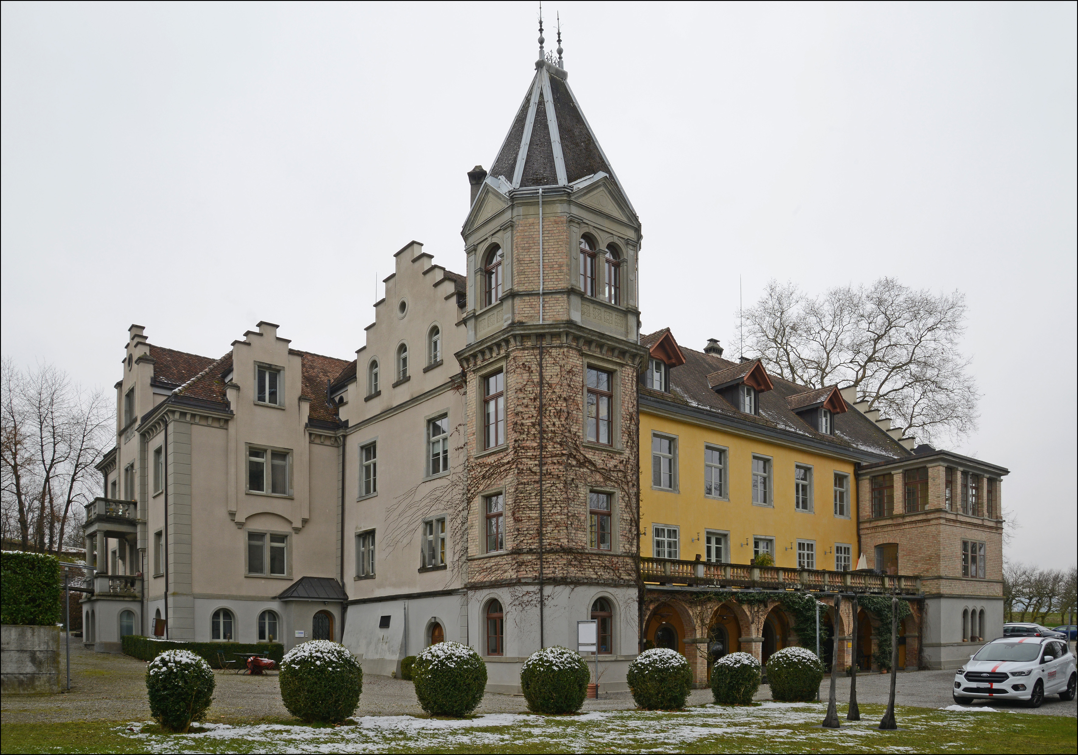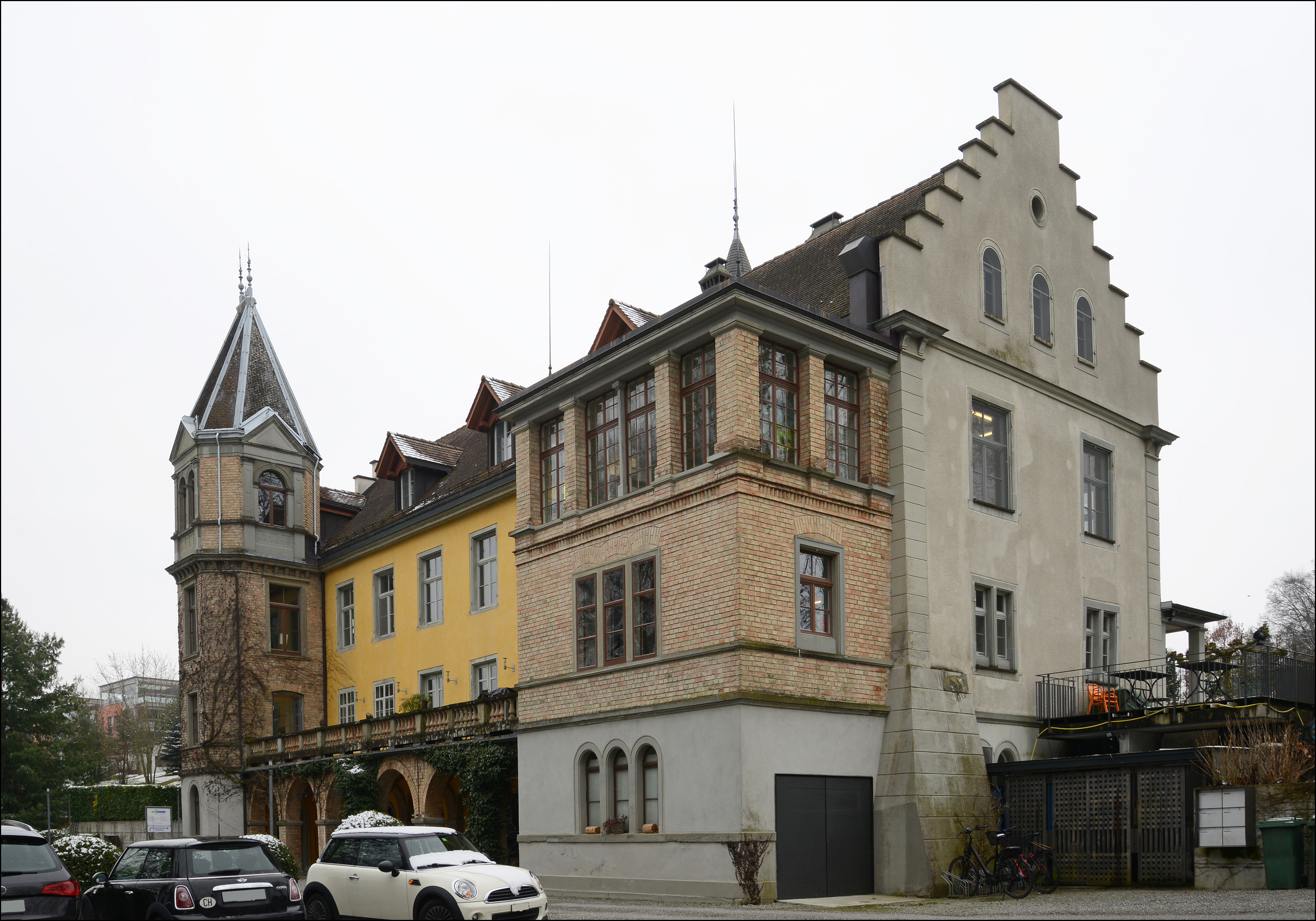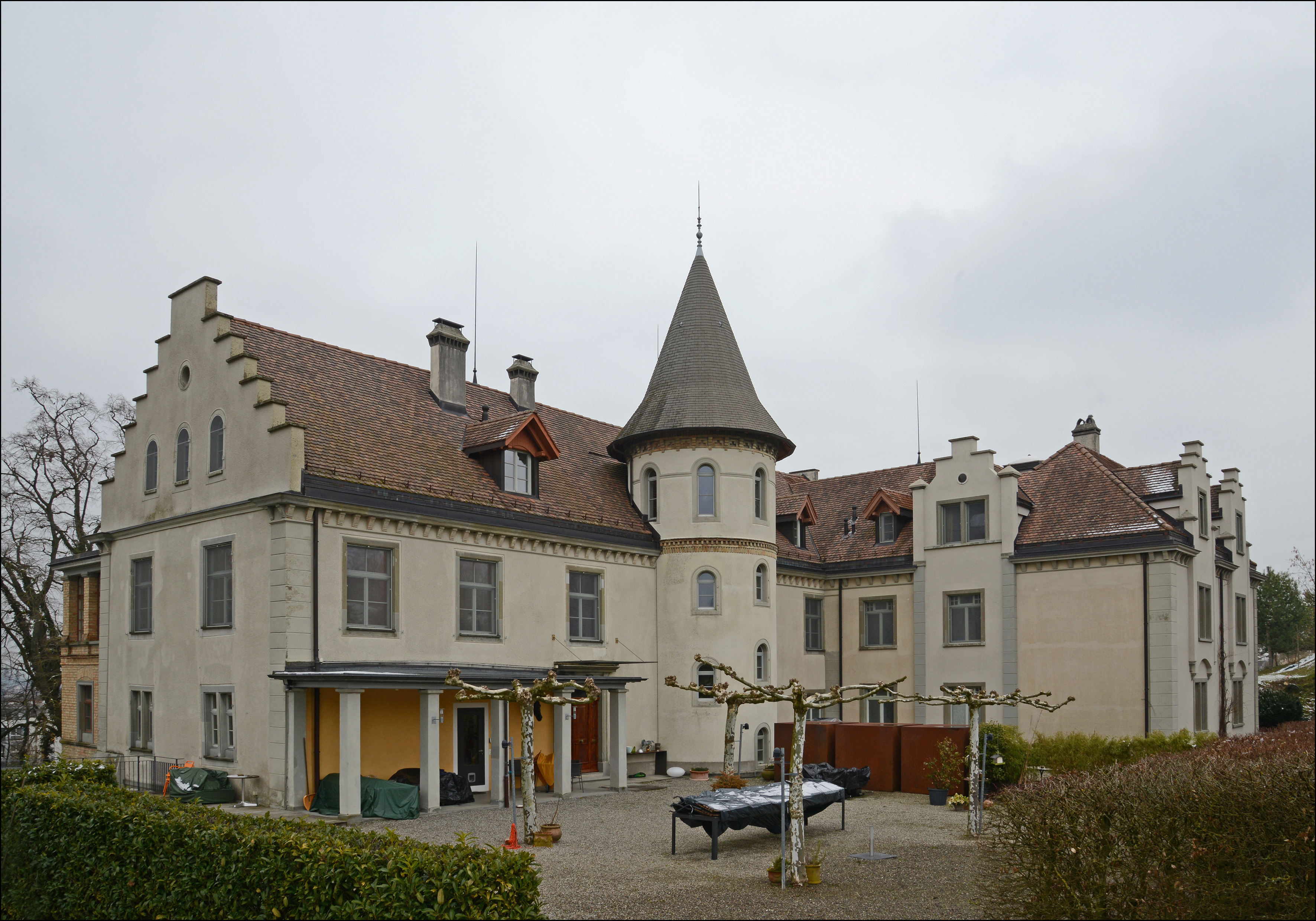Schloss Brunegg, neu erbaut 1679-1682 allenfalls mit Verwendung eines älteren Kerns durch das Prämonstratenserstift Obermarchtal an der Donau, umgestaltet zum heutigen Aussehen um 1875/76. Dreigeschossiger Massivbau, bestehend aus einem nördlichen und einem südlichen Flügel mit verschiedenen Anbauten. Fassaden bauteilweise regelmässig gegliedert. Nördlicher Flügel mit Satteldach und Staffelgiebeln. In Südfassade ein runder Treppenturm mit Spitzhelm, westlich daneben eine Laube. Bei der Nordfassade an der Nordostecke ein polygonaler, viergeschossiger Turm mit Spitzhelm und zur Nordwestecke ein flach gedeckter, dreigeschossiger Anbau, beide verbunden durch einen fassadenbreiten Arkadengang mit Terrasse. Südlicher Flügel mit Walmdach, Risaliten und Zwerchhäusern mit Staffelgiebeln. Hier an Ostfassade vor Risalit ein dreigeschossiger Vorbau mit zwei Balkonen. Sockelgeschoss glatt verputzt, Fassaden darüber mit Spritzbewurf. Einzelne Bauteile zusätzlich mit profilierten Geschossbändern und rustizierten Lisenen aus Sandstein gegliedert. Der polygonale Turm und der nordwestliche Anbau über verputztem Sockelgeschoss aus Sichtbackstein. Die Arkaden des Arkadengangs und die Gewölberippen aus Sichtbackstein, Kappen glatt verputzt. Brüstungen der Balkone und Terrassen mit runden und eckigen, vasenförmigen Balustern aus Sandstein oder Ton. Fenster unterschiedlich gestaltet mit einfachen oder profilierten Sandstein-, Putz- oder Backsteineinfassungen. In Arkadengang das rundbogige Hauptportal mit reich verzierter Rahmenfüllungstür und schmiedeeisernen Ziergittern. Über dem Portal ein rundbogiges Sandsteinband mit der Inschrift «Horas non numero nisi serenas». Die Dachdeckung aus Biberschwanzziegeln. Treppentürme mit Eternitschindeln gedeckt. Dachuntersicht z.T. verbrettert oder mit profilierten Gesimsen oder einem Konsolfriesband verziert. Inneres mit dichtem Bestand an zeittypischer, qualitätvoller Ausstattung. Schlossanlage auf der Anhöhe ausserhalb und südwestlich von Kreuzlingen, unterhalb der Bahnlinie gelegen. In Sichtbezug südlich davon die Schlossanlage Girsberg. Parkanlage mit altem Baumbestand. Fläche um Gebäude gekiest. 1363 erste Erwähnung als Gut des Konstanzer Bürgers Eglolf Blarers. 1626 Gutsname wird von "Unter-Girsberg" zu "Brunegg" umbenannt. 1679-1682 Neubau vermutlich unter Verwendung älterer Bauteile. 1773/74 Renovation der Kapelle. 1833 Einbau einer Bierbrauerei in der Kapelle. 1875/76 Umgestaltung durch Dr. Ludwig Binswanger und Architekt Otto Tafel aus Stuttgart zum heutigen Anwesen. Ab 1885 zeitweise als Dépendance der psychiatrischen Klinik "Bellevue" genutzt. 1903 Neubau Südflügel durch Chiodera & Tschudy Zürich. 1907 Einbau Saal in Hauptgebäude durch Knuchel & Kahl. 1997/98 Gesamtsanierung. Das Gebäude zählt aufgrund seiner geschichtlichen, gestalterischen und ortsbaulichen Eigenschaften sowie aufgrund seiner qualitätvollen Ausstattung zu den bedeutendsten Bauten am Ort. Dokumentation: Amt für Denkmalpflege, Budget-Berichte 1999, S. 93f. - Engelsing, Tobias/Reene, Anne-Katrin: Schlösser am See. Burgen und Landsitze am westlichen Bodensee. Konstanz 2012, S. 32-33. - Erni, Peter/Raimann, Alfons. Die Kunstdenkmäler des Kantons Thurgau. Band 7: Der Bezirk Kreuzlingen I. Die Stadt Kreuzlingen. Bern 2009. S. 239, 251-257. - Hornung, René. Fünf Generationen Uhler. Die Emmishofer Baumeisterfamilie prägte Kreuzlingen. Kreuzlingen 2012, S. 28-29. - Brandkataster Staatsarchiv TG. |