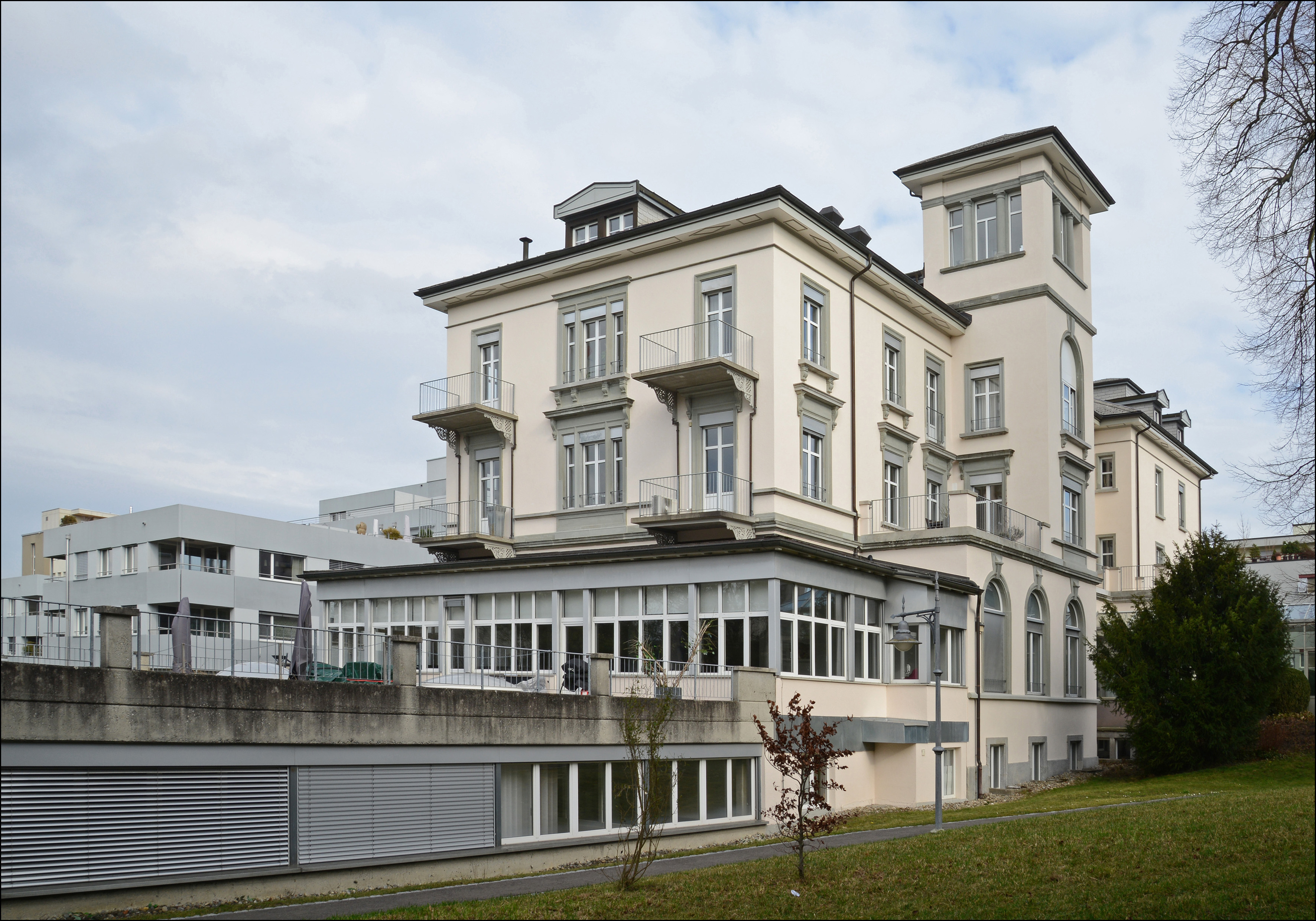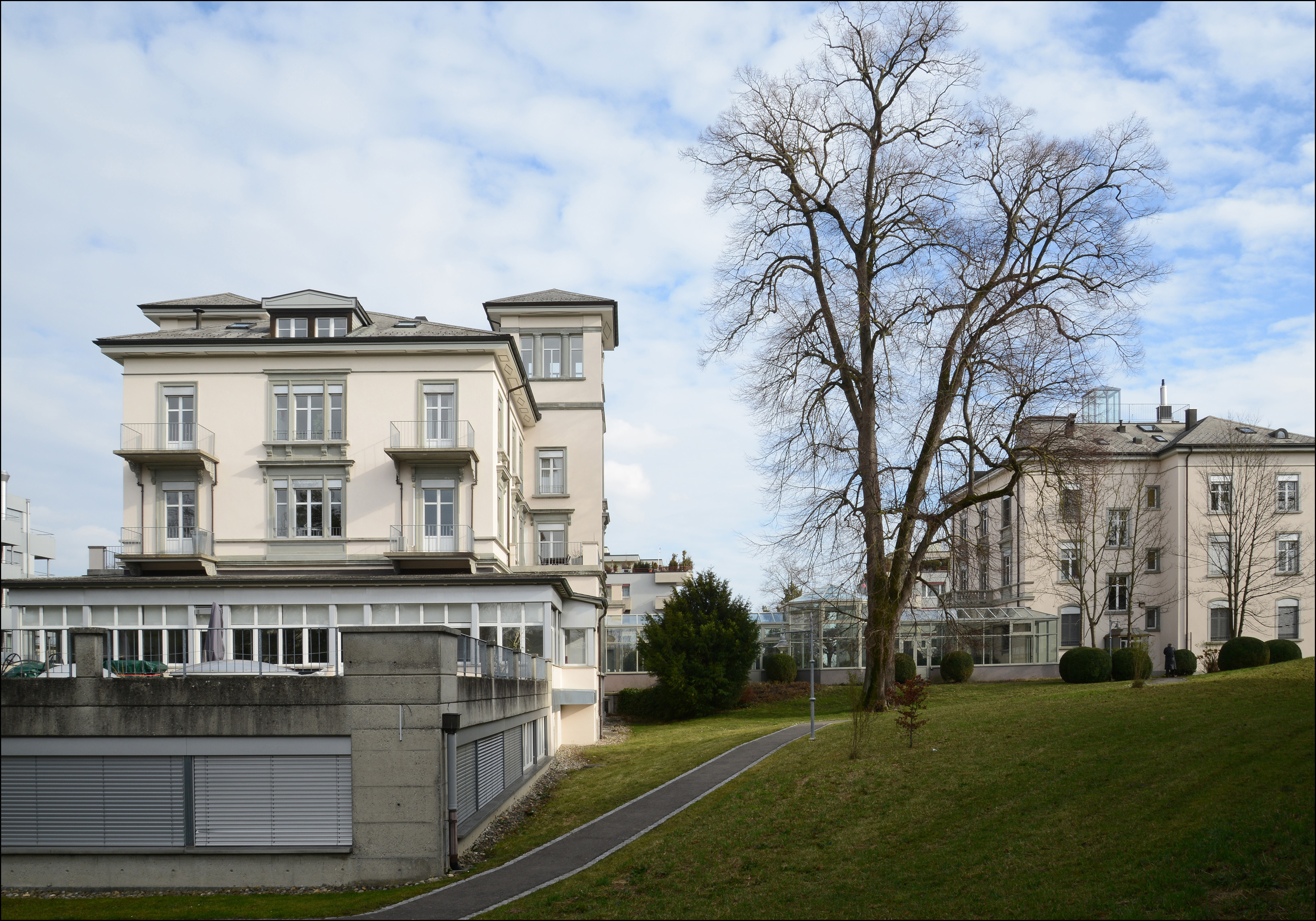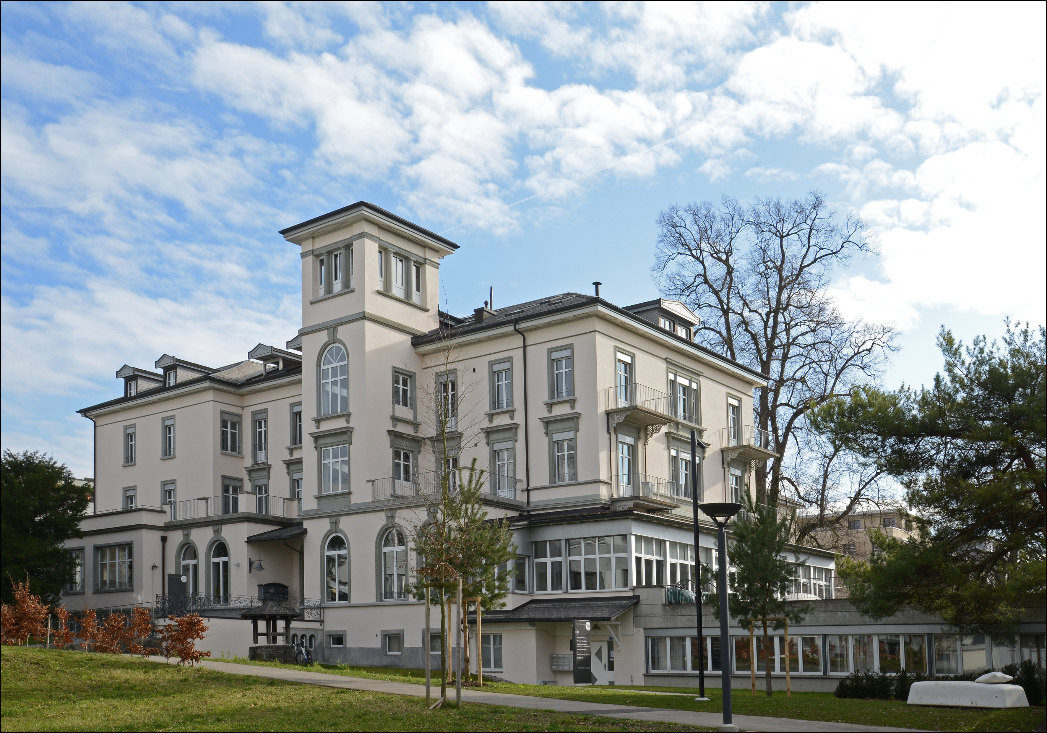 Villa "Bellevue", erbaut 1842/43 als Wohn- und Geschäftshaus und 1901 erweitert. Kopfbau als dreigeschossiger Massivbau mit flachem Walmdach und zahlreichen Dachhäuschen. Der Haupteingang in der Ostfassade unter Portikus mit Terrasse, erschlossen über eine mehrstufige geschwungene steinerne Freitreppe. Fassaden regelmässig gegliedert, Sockel und Fassaden glatt verputzt mit gemaltem Gurtband. Türen und Fenster mit Steingewänden, im Erdgeschoss Brüstungsfelder in Sandstein. Dachdeckung mit Eternitschindeln, Dachuntersicht mit geometrischer Verzierung. Auf der Vorderseite des Portikus Beschriftung "BELLE VUE" in Stein gehauen und vergoldet. Rückwärtiger dreigeschossiger Erweiterungsbau, achsensymmetrisch aufgebaut, Fassaden regelmässig gegliedert. Vor Süd- und Nordfassade jeweils ein viergeschossiger Turm mit «Bellevue», integriert in einen Vorbau mit hohen Rundbogenfenstern und darüberliegender Terrasse. Rückseitig im Erdgeschoss ein Fensterband, in den darüberliegenden Geschossen jeweils zwei Balkone auf schmiedeeisernen, verzierten Konsolen. Fassadengestaltung neoklassizistisch, Türme und Anbauten mit Gurtbändern gegliedert. Türen und Fenster mit Sandsteingewänden, z. T. rundbogig mit Schlusssteinen oder mit Verdachungen und Konsolen. Zwischen Haus "Bellevue" und Villa "Roberta" ein moderner Verbindungstrakt aus Glas mit Pavillon. Im Innern Teil des historischen Treppenhauses mit vergittertem Liftschacht und geschreinerten Liftkabine erhalten, Rest weitestgehend modernisiert. Hoher Situationswert zusammen mit der benachbarten Villa Roberta am Anfang der Hauptstrasse. 1843 erbaut als Wohn- und Geschäftshaus der Druckerei "Bellevue". 1857 Umnutzung und Umbau zur Nervenheilanstalt. 1863 Erhöhung des rückseitigen Speisesaaltrakts (ehem. Druckerei). 1901 rückseitige Erweiterung mit Türmchen und Anfügen von Vorhalle bei Haupteingang durch Architekten Chiodera & Tschudy. 1979 Sanierung. 1988/89 Gesamtsanierung durch Bauformat AG mit Neubau des Verbindungsgangs zur Villa "Roberta", Purifizierung der Fassaden und Neubau des eingeschossigen Hallenanbaus, Modernisierung des Inneren. Mit der Villa "Roberta" zusammen einziger Rest des ursprünglich grossen Sanatoriumsgeländes "Bellevue" der Psychiater-Familie Binswanger, die u. a. internationale Gäste wie z. B. Ernst Ludwig Kirchner, Vaslav Nijinski, Simon Frank, Aby Warburg und Alice von Battenberg behandelte. Das Gebäude zählt daher aufgrund seiner geschichtlichen, gestalterischen und ortsbaulichen Eigenschaften zu den bedeutenden Bauten am Ort. Dokumentation: Debrunner, Albert. Literaturführer Thurgau. Frauenfeld 2008, S. 71. - Engelsing, Tobias/Reene, Anne-Katrin: Schlösser am See. Burgen und Landsitze am westlichen Bodensee. Konstanz 2012, S. 43-45. - Keller, Stefan/Stark, Barbara/Meile, Felicitas. Eine Landschaft erzählt. Bilder vom Bodensee aus der Sammlung Hans E. Rutishauser. Hg. Reinhart, Heinz. Sulgen 2013, S. 70-71. - Erni, Peter/Raimann, Alfons. Die Kunstdenkmäler des Kantons Thurgau. Band 7: Der Bezirk Kreuzlingen I. Die Stadt Kreuzlingen. Bern 2009. S. 237-245, 359. - Schneider, Anna. Räume und Gegenräume. Heidi Buchers Häutungsaktion in der Psychiatrie Bellevue in Kreuzlingen 1988. Masterarbeit. Winterthur 2020. - Brandkataster Staatsarchiv TG. |